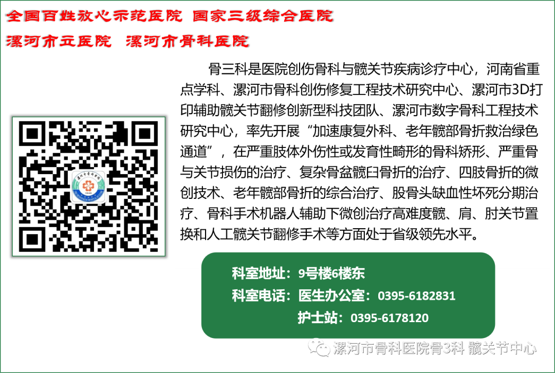 骨三科作為漯河市髖關(guān)節(jié)治療中心,90歲以上老人,占據(jù)科室住院患者1/3以上,為更好的為老年患者服務(wù),骨三科開辟了老年髖部骨折患者綠色通道,精準(zhǔn)治療,使老年髖部骨折患者快優(yōu)康復(fù),避免長(zhǎng)期臥床,減少并發(fā)癥的發(fā)生,大大的降低了老年髖部骨折一年內(nèi)死亡率。近年來,我院出臺(tái)了諸多方便老年人就醫(yī)的服務(wù)措施,持續(xù)提升患者就醫(yī)服務(wù)體驗(yàn),以實(shí)際行動(dòng)為患者送溫暖、辦實(shí)事、做好事,營(yíng)造敬老愛老助老的良好氛圍。