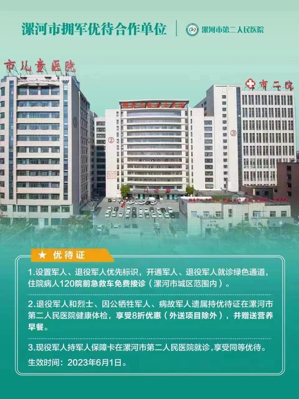 為進(jìn)一步發(fā)揮在擁軍優(yōu)撫事業(yè)中的積極作用,醫(yī)院進(jìn)一步設(shè)置了軍人、退役軍人優(yōu)先標(biāo)識(shí),開通軍人、退役軍人就診綠色通道,住院病人120院前急救車免費(fèi)接診;退役軍人和烈士、因公犧牲軍人、病故軍人遺屬持優(yōu)待證在漯河市第二人民醫(yī)院健康體檢,享受8折優(yōu)惠,并贈(zèng)送營(yíng)養(yǎng)早餐?,F(xiàn)役軍人持軍人保障卡在該院就診,享受同等優(yōu)待。