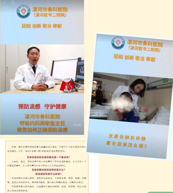 入秋以來(lái)呼吸道疾病高發(fā),醫(yī)院結(jié)合日常工作經(jīng)驗(yàn),不斷加強(qiáng)公眾教育和健康宣傳。邀請(qǐng)兒科、呼吸內(nèi)科等科室的多位專家錄制科普視頻,并利用視頻號(hào)、抖音號(hào)等多平臺(tái)向公眾發(fā)布健康宣教知識(shí)。同時(shí),向各科室征集健康科普文章,通過(guò)漯河市骨科醫(yī)院微信公眾平臺(tái)及省市級(jí)媒體進(jìn)行發(fā)布,多渠道向公眾普及兒童常見疾病的預(yù)防和治療知識(shí),為支原體肺炎的預(yù)防和應(yīng)急處理提供支持,提高家長(zhǎng)們的健康意識(shí)和應(yīng)對(duì)能力。