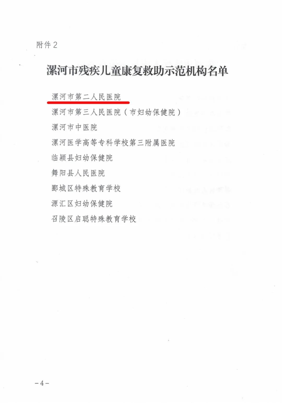 11月21日,根據(jù)《關(guān)于開展漯河市殘疾人康復(fù)示范點和殘疾兒童康復(fù)救助示范機構(gòu)創(chuàng)建活動的通知》要求,經(jīng)機構(gòu)自薦申請、市殘聯(lián)復(fù)審等各環(huán)節(jié)工作,市二院被漯河市殘疾人聯(lián)合會命名為市殘疾兒童康復(fù)救助示范機構(gòu)。