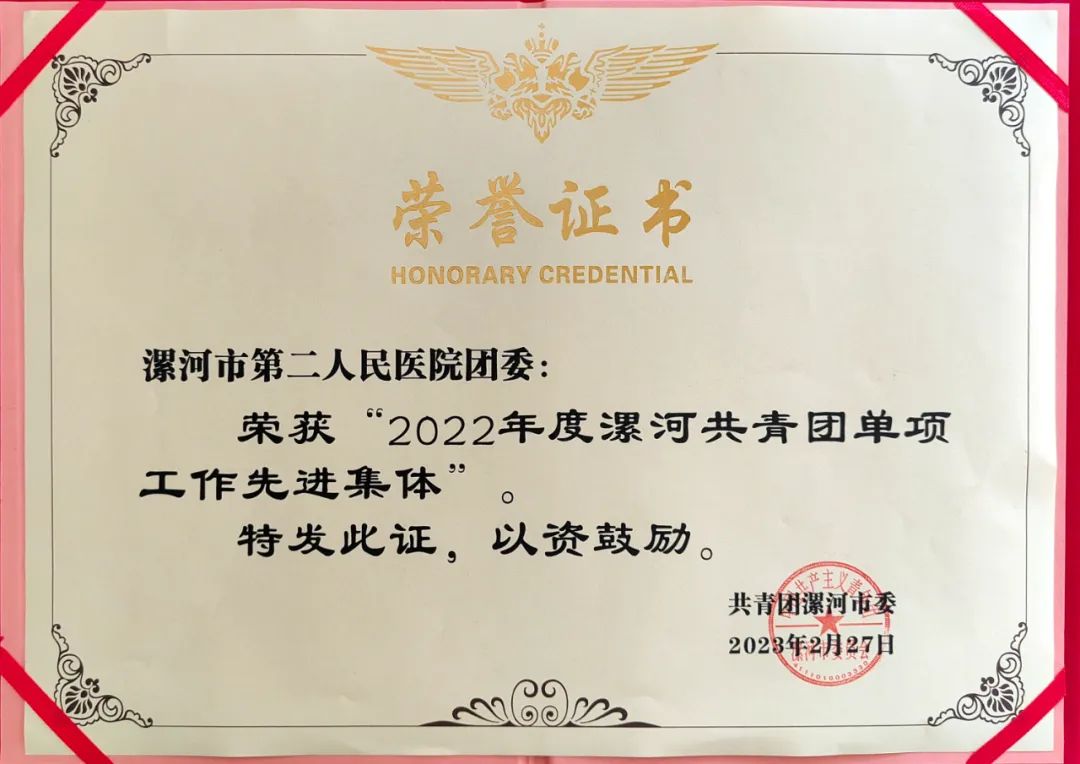 2月28日,共青團漯河市五屆十二次全委(擴大)會議召開,市二院團委因志愿服務(wù)工作被表彰為“2022年度漯河共青團單項工作先進集體”。