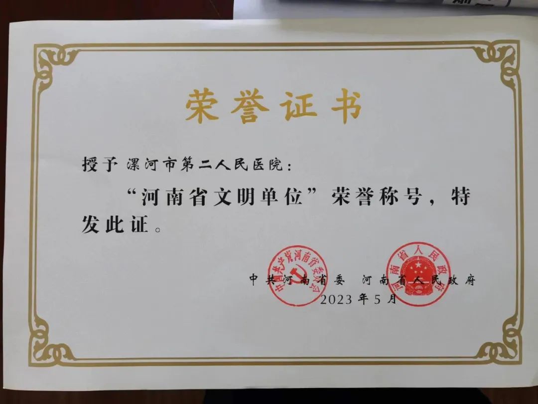 9月,中共河南省委、河南省人民政府發(fā)布《關(guān)于命名新一屆河南省文明城市文明村鎮(zhèn)文明單位文明家庭的決定》(豫文〔2023〕50號),市二院再次榮獲新一屆“河南省文明單位”榮譽稱號。