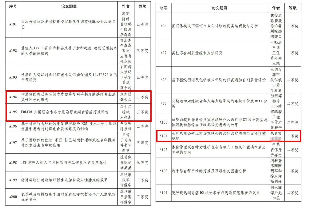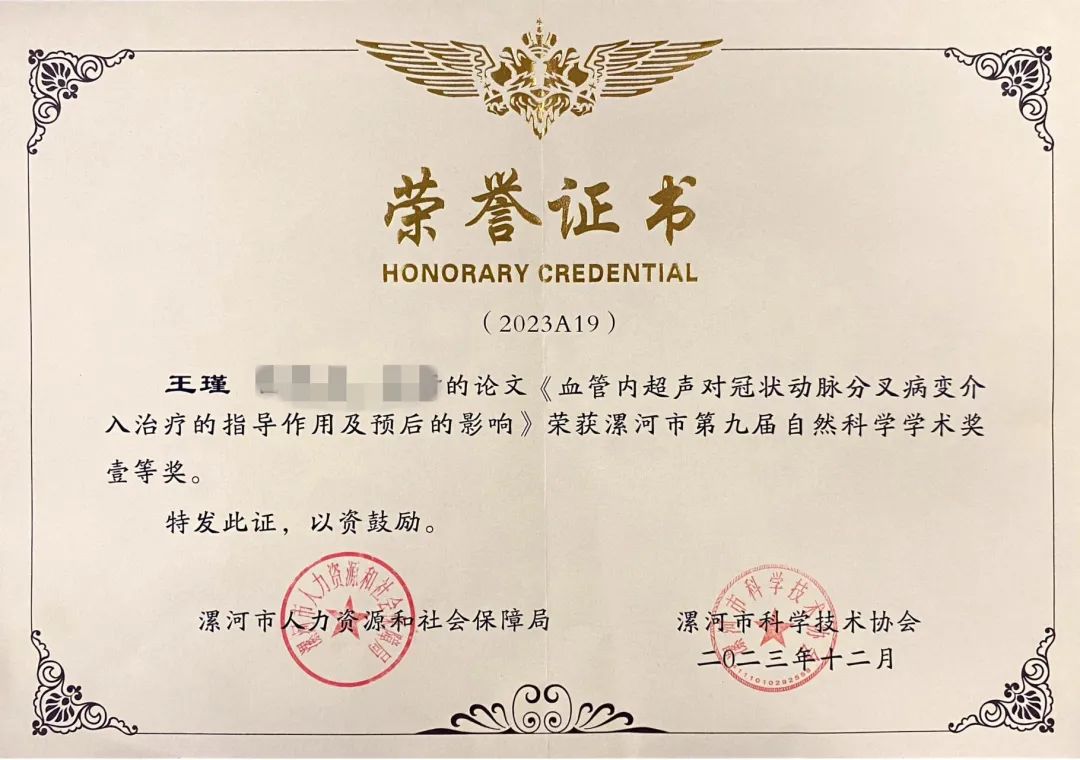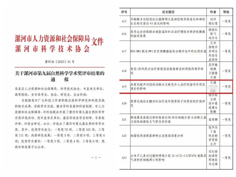 近日,漯河市人力資源和社會保障局、漯河市科學技術協(xié)會公布漯河市第九屆自然科學學術獎優(yōu)秀學術論文評選結(jié)果。市二院院長王瑾《血管內(nèi)超聲對冠狀動脈分叉病變介入治療的指導作用及預后的影響》、《血管內(nèi)超聲指導經(jīng)皮冠狀動脈介入治療非 ST 段抬高型急 性冠狀動脈綜合征臨界病變患者的效果》分別榮獲一等獎和二等獎;中醫(yī)針灸科主任朱青霞《玉屏風散合牽正散加減聯(lián)合透滯針治療周圍性面癱療效觀察》榮獲二等獎;腫瘤科副主任醫(yī)師翟中武《FOLFOX 方案聯(lián)合吉非替尼治療晚期食管癌療效評價》、顯微外科主治醫(yī)師劉東博的《指掌側(cè)固有動脈背側(cè)支皮瓣修復對手指皮膚缺損者血清炎性因子的影響》榮獲三等獎。