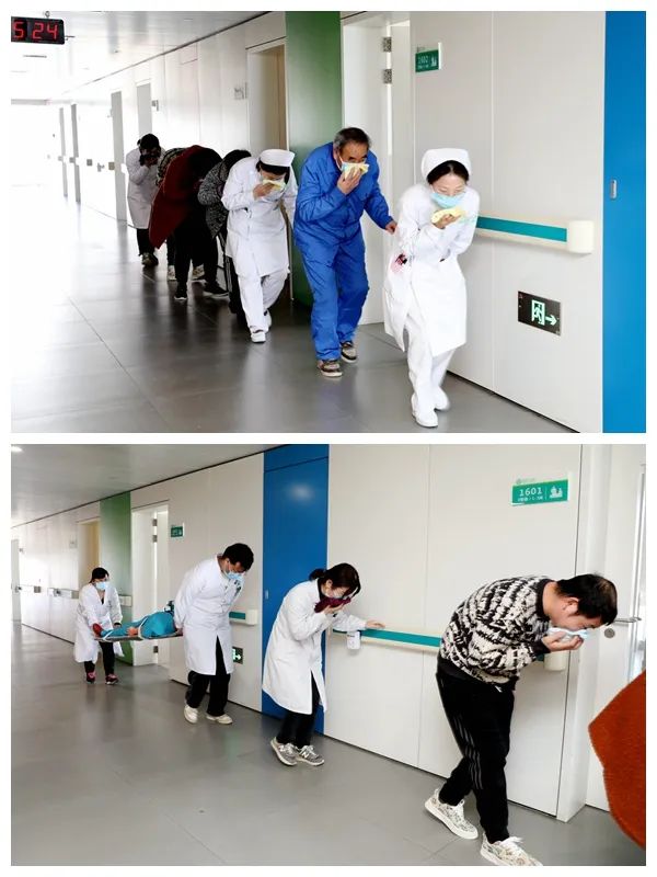 按照預(yù)案流程,醫(yī)院各救援小組緊急開展救援,科室醫(yī)護(hù)人員立即組織引導(dǎo)患者和家屬有序進(jìn)行疏散撤離。對(duì)于不能行動(dòng)的病人,醫(yī)護(hù)人員通過擔(dān)架迅速將其轉(zhuǎn)移至安全地帶。