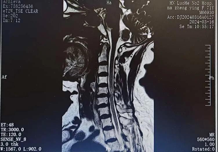 近日,70歲的馬阿姨,因摔傷后出現(xiàn)持續(xù)性頸部疼痛伴右側肢體無力、麻痛,影響日常生活。于是來到市二院神經(jīng)外科就診,經(jīng)檢查發(fā)現(xiàn):頸椎MR示:頸3/4、4/5、5/6、6/7椎間盤變性突出(中央型)并繼發(fā)性椎管變窄,頸椎退行性改變,頸5椎體水平頸髓水腫。神經(jīng)外科副主任劉沛濤根據(jù)患者癥狀、體征、影像學三者結合診斷為“脊髓型頸椎病”,考慮到患者癥狀逐漸加重、保守治療效果不佳等情況,建議盡快手術治療。