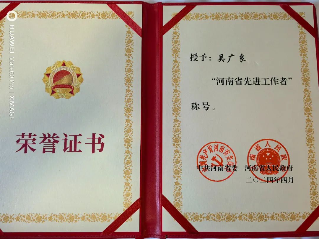 吳廣良自從事醫(yī)學臨床和教學工作以來,具有較強的政治覺悟和政治理論水平。始終對自己高標準、嚴要求,努力學習,敬業(yè)工作,無私奉獻,在平凡的工作崗位上,干出不平凡的業(yè)績,成為人們身邊的學習榜樣。其先后榮獲河南衛(wèi)生健康工作先進個人、漯河市科技工作先進個人、漯河市第二屆科技帶頭人、第二屆“人民健康衛(wèi)士”、2018年度漯河市勞動模范、2019年全國改善醫(yī)療服務突出貢獻工作者等稱號。