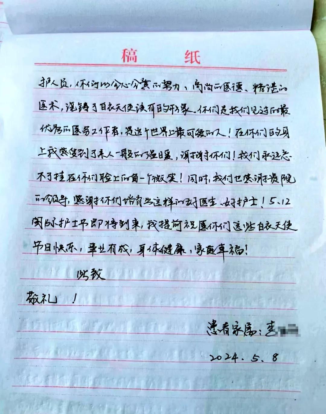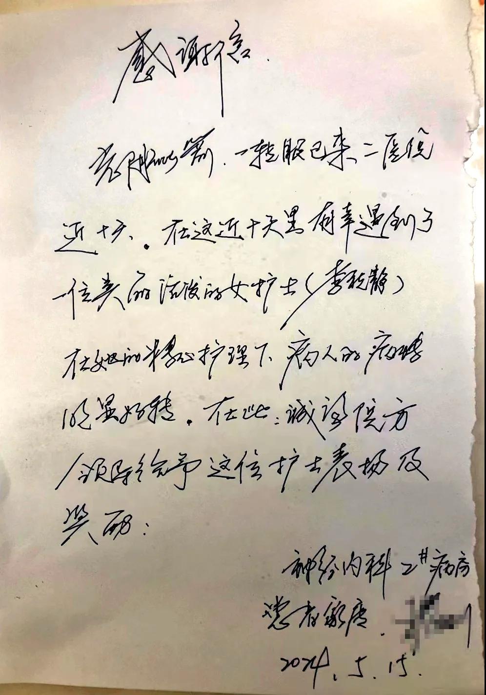 患者張女士長期受困于癱瘓狀態(tài),無法正常行走與進(jìn)食,且伴有四肢肌張力異常增高的癥狀。在呂杰民主任與曹軍軍醫(yī)生共同制定的精確治療方案下,以及護(hù)理團(tuán)隊(duì)持續(xù)、細(xì)致地照料,患者病情得到顯著改善。為感謝護(hù)士李秋靜在住院期間對患者提供的無微不至的關(guān)懷,5月15日,在即將出院之際,患者家屬將一封感謝信送到科室,以表達(dá)由衷的感激之情。