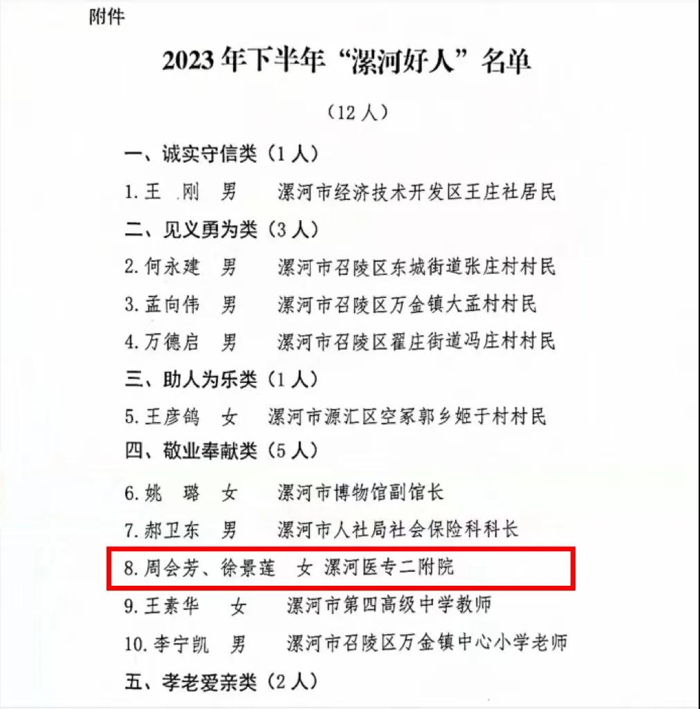 其中,來自漯河市骨科醫(yī)院(漯河醫(yī)專二附院、漯河市立醫(yī)院)的周會芳、徐景蓮光榮入選2023年下半年“漯河好人榜”!