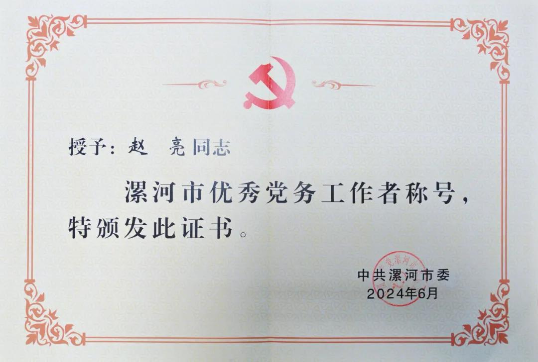 6月27日,全市“兩優(yōu)一先”表彰大會(huì)召開,市二院趙亮榮獲“漯河市優(yōu)秀黨務(wù)工作者”榮譽(yù)稱號(hào)。