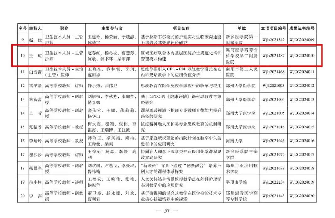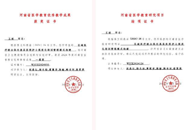 近日,河南省衛(wèi)生健康委員會下發(fā)了《關(guān)于公布2024年河南省醫(yī)學(xué)教育研究項目立項教學(xué)成果和優(yōu)質(zhì)課評選結(jié)果的通知》,由漯河市骨科醫(yī)院(漯河醫(yī)專二附院、漯河市立醫(yī)院)王瓊、趙春紅、楊冬松、曹慧芳、陳敏、韓書環(huán)、柴翠萍團(tuán)隊完成的《區(qū)域醫(yī)療聯(lián)合體內(nèi)基層醫(yī)院護(hù)士規(guī)范化培訓(xùn)管理模式構(gòu)建》項目完成結(jié)項,被授予2024年河南省醫(yī)學(xué)教育優(yōu)秀教學(xué)成果一等獎。