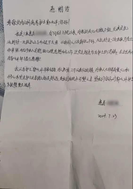 病情穩(wěn)定后,患者及家屬特意送來(lái)感謝信,向心內(nèi)一科的全體醫(yī)務(wù)人員表達(dá)感謝。漯河市骨科醫(yī)院(漯河醫(yī)專(zhuān)二附院、漯河市立醫(yī)院)心血管內(nèi)科一病區(qū)(內(nèi)三科)始終以病人為中心,以專(zhuān)業(yè)的技術(shù)和細(xì)致入微的關(guān)懷提供優(yōu)質(zhì)醫(yī)療服務(wù),全力以赴為病人的健康保駕護(hù)航!(盧 闖 劉 旭 袁錦鈺)