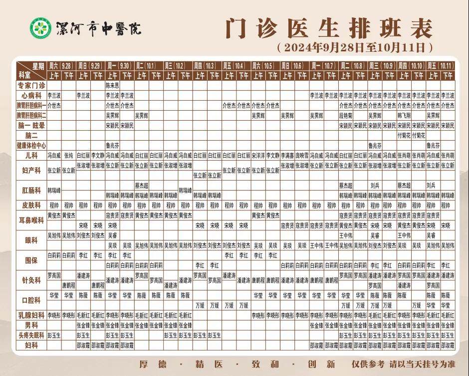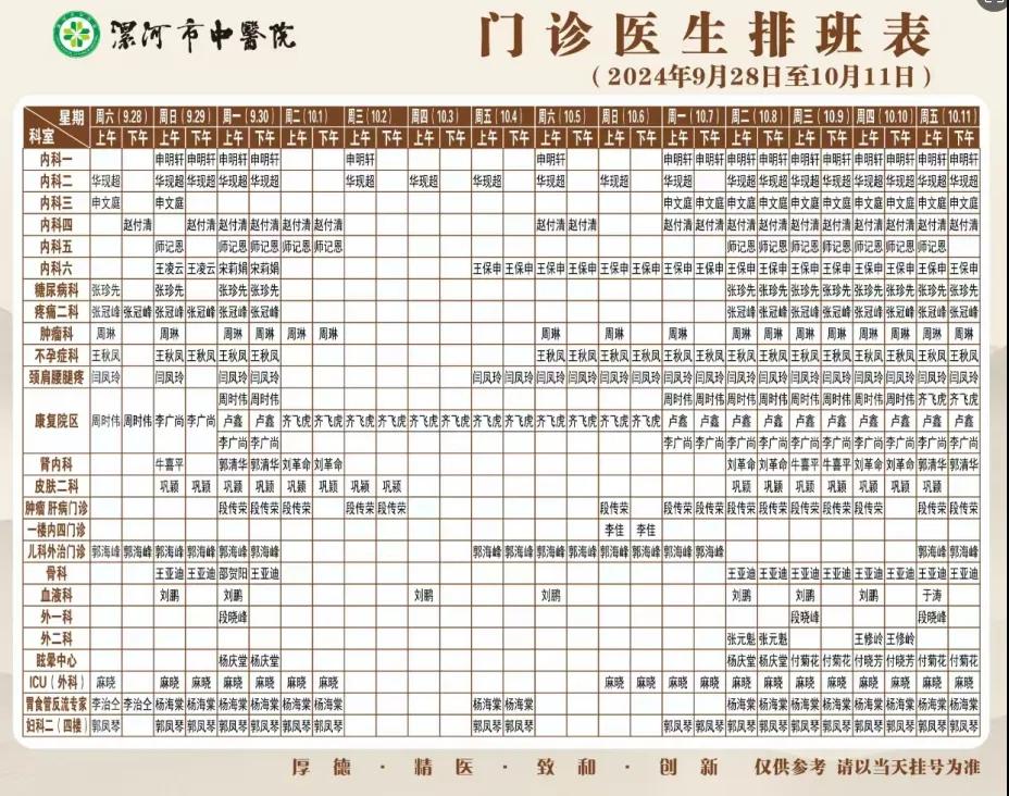 漯河市中醫(yī)院國(guó)慶節(jié)期間門診醫(yī)生排班和就醫(yī)指南來(lái)啦~