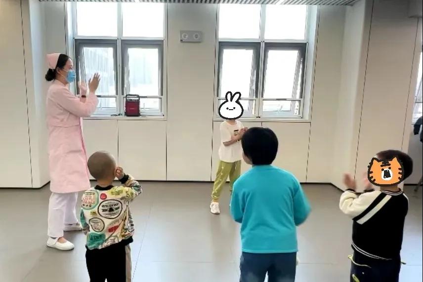 每天固定的時間和地點組織患兒與患兒家屬在七樓大廳做親子小律動操,聽音樂做運動,不僅可以鍛煉孩子的粗大運動的協(xié)調(diào)性;改善孩子們的溝通能力和集體活動的參與性;歡快的音樂可以刺激神經(jīng)系統(tǒng)的興奮性,抑制低落情緒,緩解緊張、焦慮,有助于穩(wěn)定患兒情緒,促進患兒身心康復。