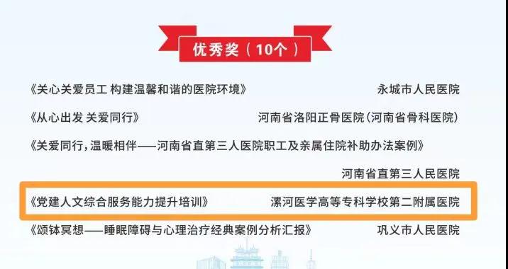 大會(huì)通報(bào)了系列活動(dòng)優(yōu)秀入圍作品名單,其中,漯河市骨科醫(yī)院(漯河醫(yī)專二附院、漯河市立醫(yī)院)報(bào)送的作品《醫(yī)路書香助力三甲》榮獲“醫(yī)路書香、豫健同行”醫(yī)院讀書活動(dòng)亮點(diǎn)特色案例一等獎(jiǎng);《大醫(yī)吳廣良》榮獲“身邊的榜樣”敘事醫(yī)學(xué)故事一等獎(jiǎng);《黨建引領(lǐng)人文綜合服務(wù)能力提升》榮獲“員工關(guān)愛(ài)計(jì)劃”優(yōu)秀案例!