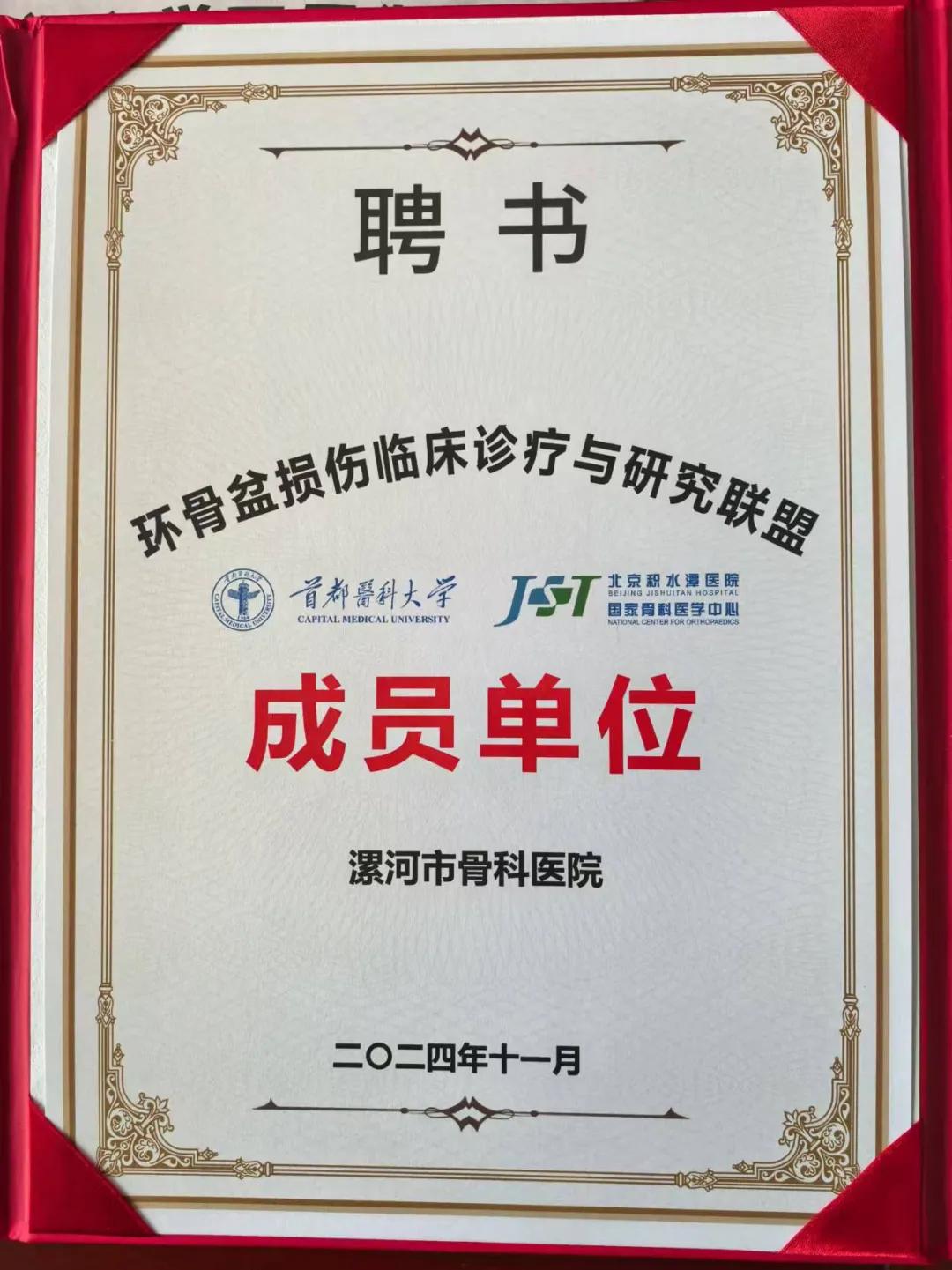 此次受邀加入該聯(lián)盟,為我院環(huán)骨盆損傷治療的進(jìn)一步發(fā)展提供了重要契機(jī),也標(biāo)志著我院在骨盆微創(chuàng)救治領(lǐng)域邁上新臺階。未來,漯河市骨科醫(yī)院將充分發(fā)揮聯(lián)盟成員優(yōu)勢,與聯(lián)盟各單位實(shí)現(xiàn)資源共享、優(yōu)勢互補(bǔ)、協(xié)同發(fā)展,并以此推動本院以及漯河市及周邊地區(qū)環(huán)骨盆損傷臨床診療領(lǐng)域的高質(zhì)量發(fā)展,造福更多的患者。(盧 闖 劉 旭 袁錦鈺)
