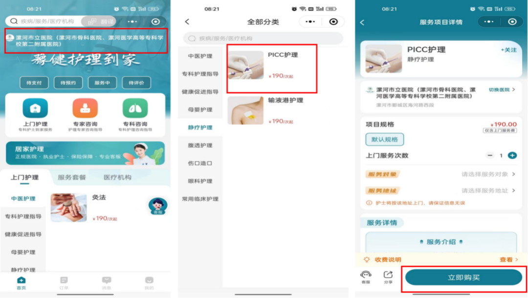 2.進(jìn)入后查看醫(yī)院是否正確,以下內(nèi)容以PICC護(hù)理為例:選擇PICC護(hù)理,點(diǎn)擊立即購(gòu)買。