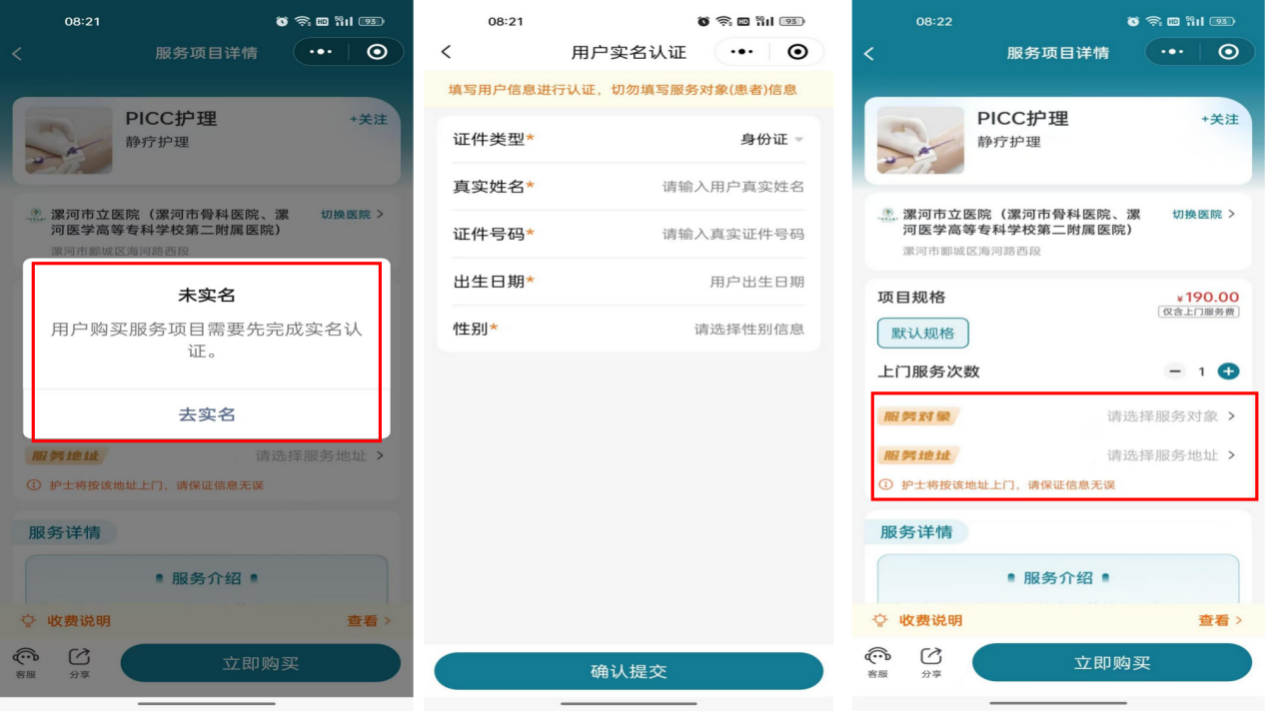 3.購(gòu)買之后需實(shí)名認(rèn)證,請(qǐng)正確填寫各項(xiàng)信息,服務(wù)對(duì)象填寫的是需要被護(hù)理的患者,地址填寫準(zhǔn)確。