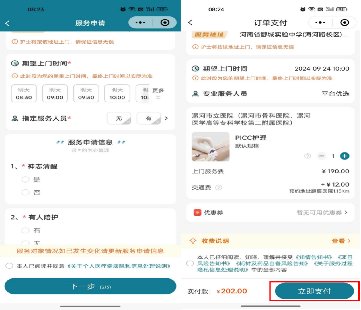 4.各項(xiàng)信息填寫后,支付訂單,護(hù)士接單后會(huì)與下單人電話聯(lián)系再次確認(rèn)。