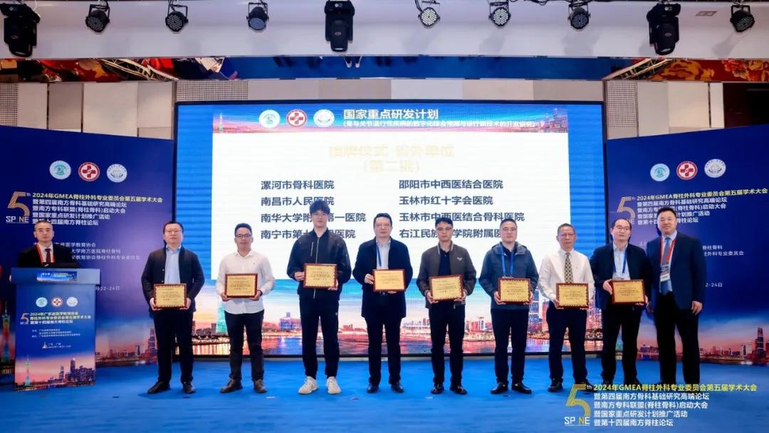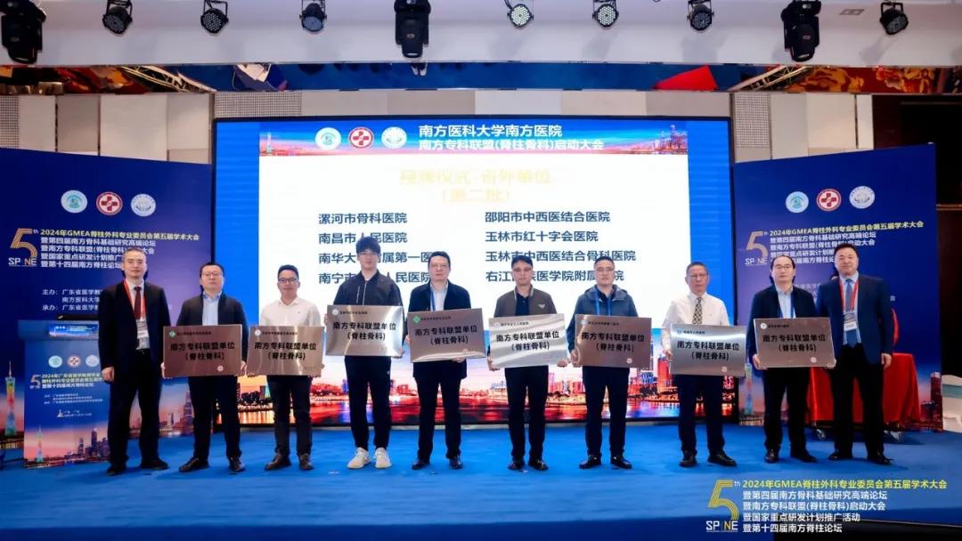 11月22日—24日,由廣東省醫(yī)學教育協(xié)會、南方醫(yī)科大學南方醫(yī)院脊柱骨科聯(lián)合主辦,廣東省醫(yī)學教育協(xié)會脊柱外科專業(yè)委員會承辦的“2024年GMEA脊柱外科專業(yè)委員會第五屆學術大會”在廣東廣州成功舉行。在南方??坡?lián)盟(脊柱骨科)啟動大會暨國家重點研發(fā)計劃推廣活動上,漯河市骨科醫(yī)院(漯河醫(yī)專二附院、漯河市立醫(yī)院)榮獲“國家重點研發(fā)計劃-骨與關節(jié)退行性疾病的數字化綜合預測與診療新技術的開發(fā)研究課題推廣單位”與“南方??坡?lián)盟單位(脊柱外科)”雙項授牌!