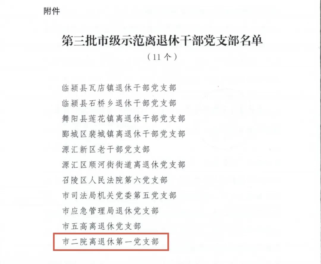 近日,市委組織部、市委老干部局印發(fā)了《關(guān)于命名第三批市級示范離退休干部黨支部的決定》(漯老〔2024〕32號),市二院離退休第一黨支部被評為第三批市級示范離退休干部黨支部,同時也是漯河市衛(wèi)生健康系統(tǒng)唯一受到表彰命名的單位。