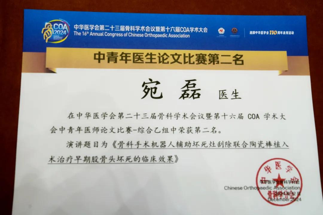 智能微創(chuàng)骨科(骨十)宛磊主任 在中青年醫(yī)生論文比賽-綜合乙組(二)會場進(jìn)行參賽發(fā)言,最終以《骨科手術(shù)機(jī)器人輔助壞死灶刮除聯(lián)合陶瓷棒植入術(shù)治療早期股骨頭壞死的臨床效果 》為題獲得中青年論文比賽第二名。
