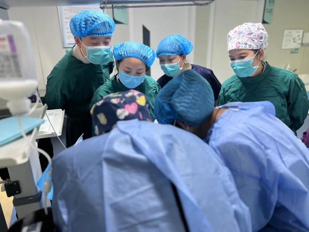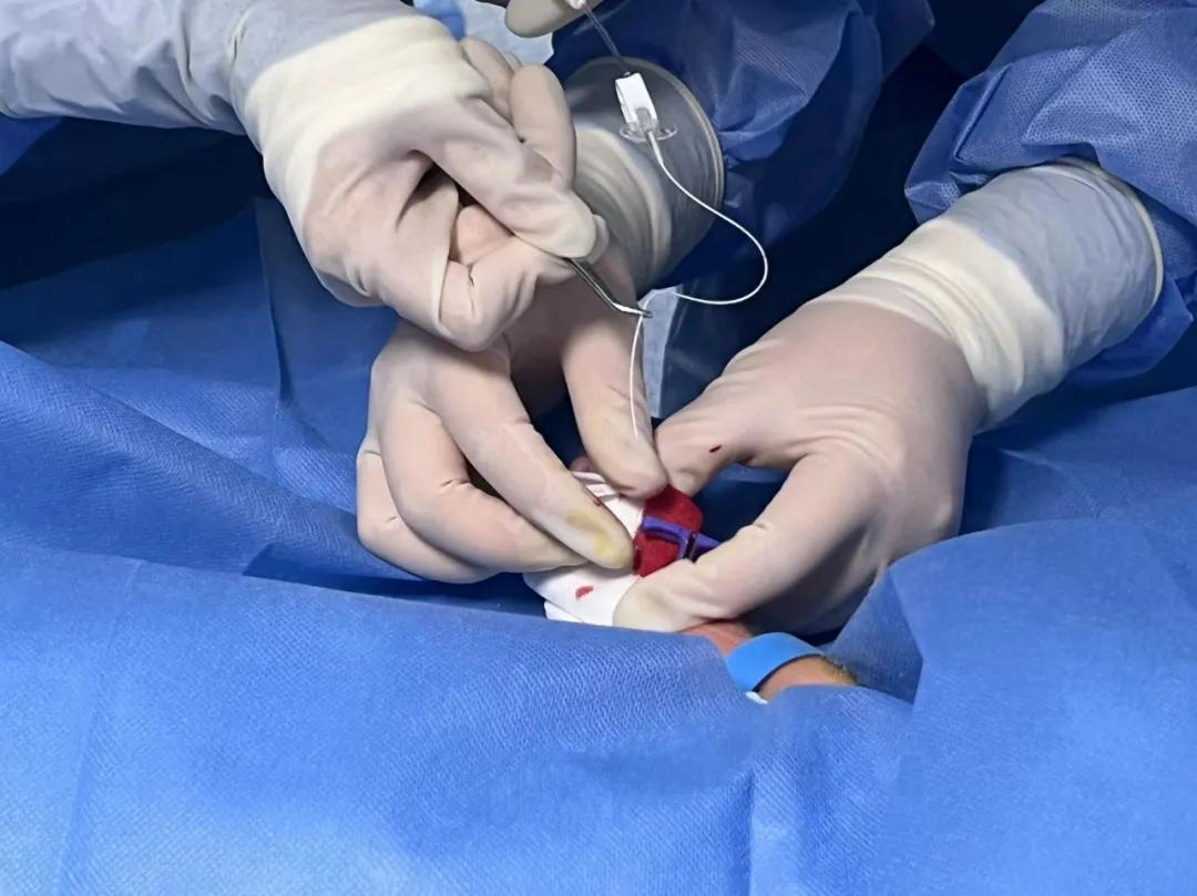 下午 16點(diǎn),在護(hù)理部副主任曹慧芳的指導(dǎo)下,兒科李紅護(hù)士長(zhǎng)與趙曙光精心進(jìn)行置管前準(zhǔn)備,血液凈化室呂春曉護(hù)士長(zhǎng)和腫瘤血液科于楊波護(hù)士長(zhǎng)全力協(xié)助,每一個(gè)細(xì)節(jié)都彰顯著團(tuán)隊(duì)的默契與協(xié)作。醫(yī)護(hù)人員全神貫注地為小天使進(jìn)行 PICC 置管穿刺。他們的每一個(gè)動(dòng)作都精準(zhǔn)而溫柔,仿佛在雕琢一件稀世珍寶,因?yàn)槲覀兩钪?,這是守護(hù)新生命的關(guān)鍵一步。