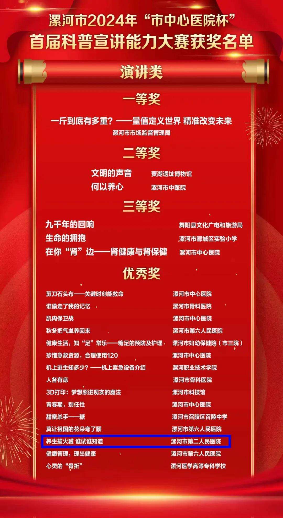 12月18日,由中共漯河市委宣傳部、中共漯河市委人才工作領(lǐng)導(dǎo)小組辦公室、漯河市科學(xué)技術(shù)協(xié)會、漯河市衛(wèi)生健康委員會聯(lián)合主辦,漯河市中心醫(yī)院冠名,漯河日報社承辦的漯河市2024年“市中心醫(yī)院杯”首屆科普宣講能力大賽決賽落下帷幕。經(jīng)過激烈角逐,市二院精心選送的參賽作品由劉橋、李媛、安自譚、袁泉、任崢崢出演的《心臟“出走”記》榮獲舞臺表演類二等獎;由井紅鴿、李靜麗、鄭家珍、丁歡歡、程亞麗出演的《此“盆”非彼“盆”》榮獲舞臺表演類三等獎;另有四個參賽作品榮獲優(yōu)秀獎。