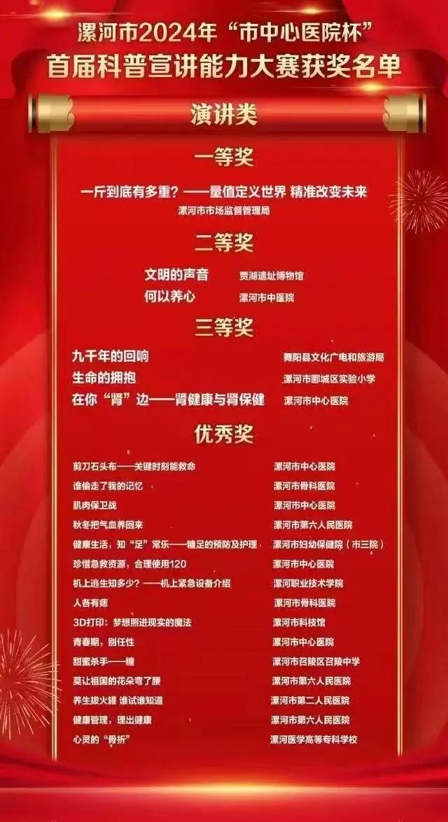 本次大賽由中共漯河市委宣傳部、中共漯河市委人才工作領(lǐng)導小組辦公室、漯河市科學技術(shù)協(xié)會、漯河市衛(wèi)生健康委員會聯(lián)合主辦。市中醫(yī)院積極響應(yīng)“普及科學知識,弘揚科學精神”的大賽主旨,送演內(nèi)容豐富,形式多樣的作品,助力健康科普理念的傳播,并取得了優(yōu)異的成績。