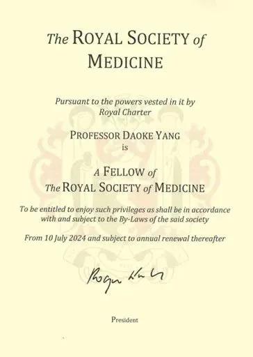 英國皇家醫(yī)學(xué)會是世界上歷史悠久、具有影響力的醫(yī)學(xué)學(xué)術(shù)組織之一,致力于推動醫(yī)學(xué)科學(xué)的發(fā)展,提升全球醫(yī)療服務(wù)水平。該學(xué)會院士頭銜授予在醫(yī)學(xué)領(lǐng)域取得了突出成就的醫(yī)師和科學(xué)家。能夠當(dāng)選為英國皇家醫(yī)學(xué)會院士,是對楊道科教授學(xué)術(shù)成就和重要貢獻的高度認可。