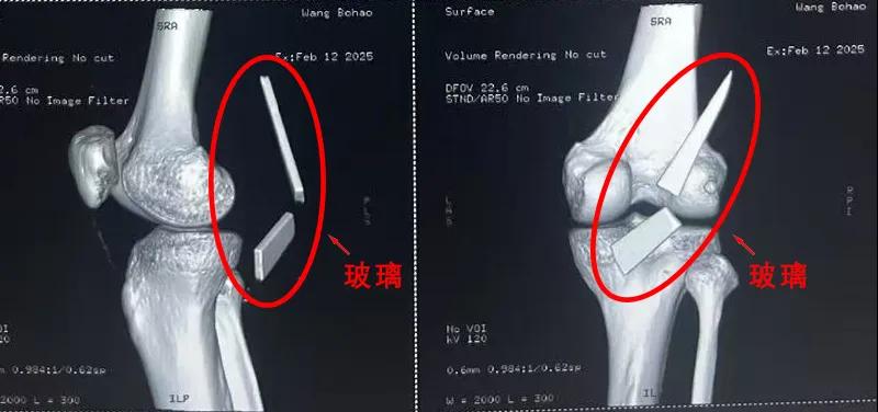 患者家屬這才開始意識(shí)到問題的嚴(yán)重性,便帶著孩子到鄉(xiāng)鎮(zhèn)衛(wèi)生院檢查——結(jié)果顯示右膝關(guān)節(jié)后方竟然殘留著兩塊兒鋒利的碎玻璃,測量后預(yù)估玻璃總長將近13厘米!