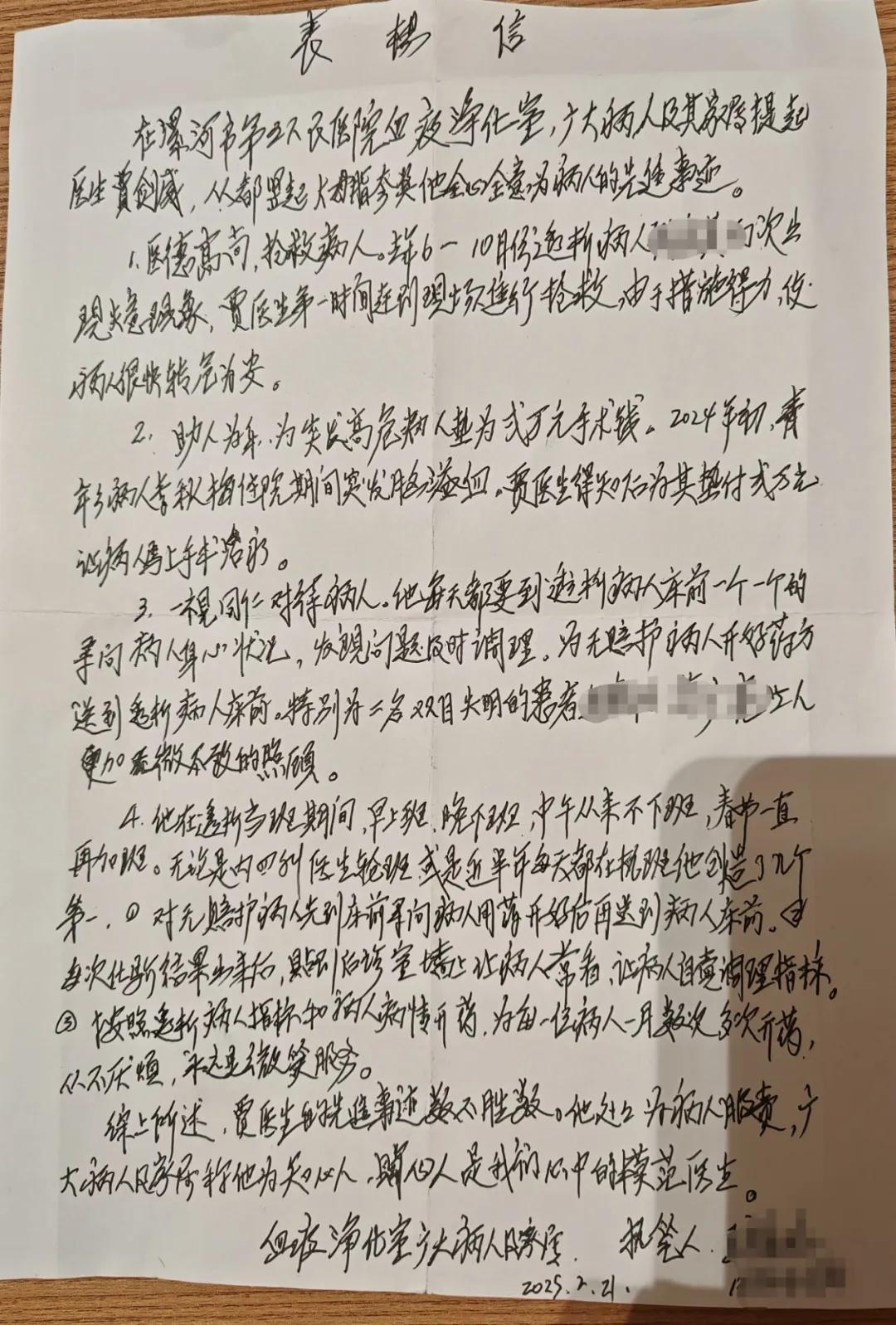 “他處處為病人服務(wù),廣大病人及家屬稱他為知心人、貼心人,是我們心中的模范醫(yī)生......”信箋上,溫暖的字句自然流淌,言語間都是對(duì)賈劍威醫(yī)生的信任與感激。