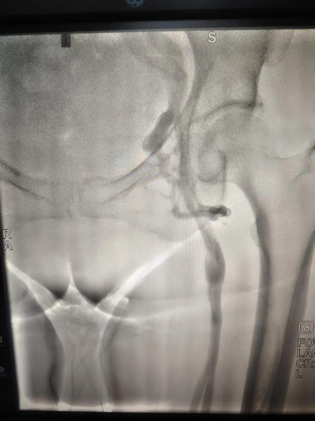 該患者,中年女性,左下肢反復(fù)腫脹、疼痛多年就醫(yī),未明病因。門診就診,經(jīng)血管外科副主任周創(chuàng)業(yè)評(píng)估病情后,為該患者門診行下肢靜脈造影,造影結(jié)果示:左髂靜脈周圍側(cè)枝形成,左髂靜脈壓迫綜合癥。明確診斷后將擇期介入手術(shù)治療。