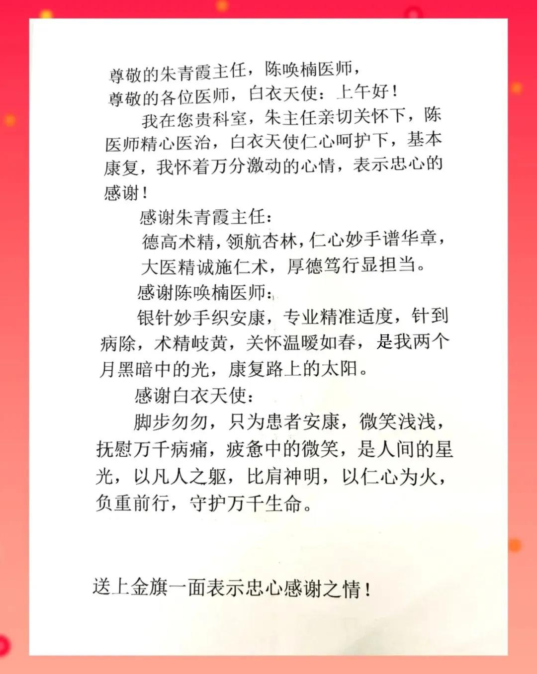 近日,市二院中醫(yī)針灸科門診醫(yī)護(hù)人員一如既往地忙碌著。突然,走廊里傳來(lái)一陣熱烈的掌聲,原來(lái),74歲的田大叔在家人陪伴下,手捧錦旗和感謝信來(lái)到醫(yī)院。田大叔激動(dòng)地展開感謝信,聲情并茂地朗讀起來(lái),說(shuō)到動(dòng)情處更是眼含熱淚,字里行間飽含著對(duì)中醫(yī)針灸科主任朱青霞的誠(chéng)摯謝意和對(duì)整個(gè)醫(yī)護(hù)團(tuán)隊(duì)精湛醫(yī)術(shù)與暖心服務(wù)的認(rèn)可與贊美。讀完,田大叔深深地鞠躬致謝,這一躬身,更是見證中醫(yī)針灸科‘破冰’三十年病痛,醫(yī)患同心最好的詮釋。
