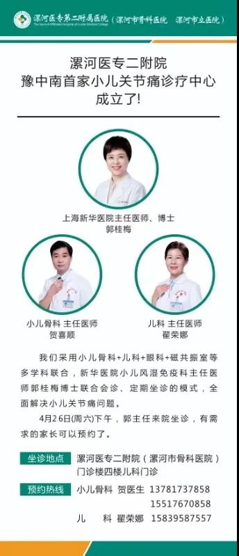 小兒關(guān)節(jié)痛診斷和治療的關(guān)鍵是通過專業(yè)診斷來區(qū)分不同的病因,為此,漯河醫(yī)專二附院(漯河市骨科醫(yī)院,漯河市立醫(yī)院)成立了豫中南地區(qū)首家“小兒關(guān)節(jié)痛多學(xué)科診療中心”!