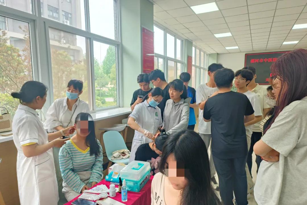 本次活動(dòng)精心組織了由頭痛失眠科、中醫(yī)內(nèi)科、針灸推拿科、皮膚科、疼痛科、外科、男性科等多學(xué)科專家組成的醫(yī)療團(tuán)隊(duì),為師生提供專業(yè)診療服務(wù)。活動(dòng)當(dāng)天,漯河市中醫(yī)院門診部七大科室的專家們?cè)缭绲貋淼搅爽F(xiàn)場(chǎng),準(zhǔn)備迎接前來咨詢的師生們?,F(xiàn)場(chǎng)人頭攢動(dòng),每個(gè)科室前都排起了長(zhǎng)隊(duì)。專家們耐心細(xì)致地詢問病史、查體、開具處方,他們不僅現(xiàn)場(chǎng)解答了師生們的疑問,還傳授了一些中醫(yī)養(yǎng)生和保健的知識(shí)。現(xiàn)場(chǎng)特別設(shè)置了中醫(yī)特色治療體驗(yàn)區(qū)和中醫(yī)藥衍生產(chǎn)品展示區(qū),通過推拿、針灸等傳統(tǒng)療法體驗(yàn)讓師生們親身體驗(yàn)中醫(yī)拔罐、刮痧、艾灸等特色療法,活動(dòng)過程中還穿插健康知識(shí)宣講,發(fā)放了健康知識(shí)宣傳頁(yè),向師生們普及了常見病、多發(fā)病的預(yù)防、健康養(yǎng)生知識(shí)。
