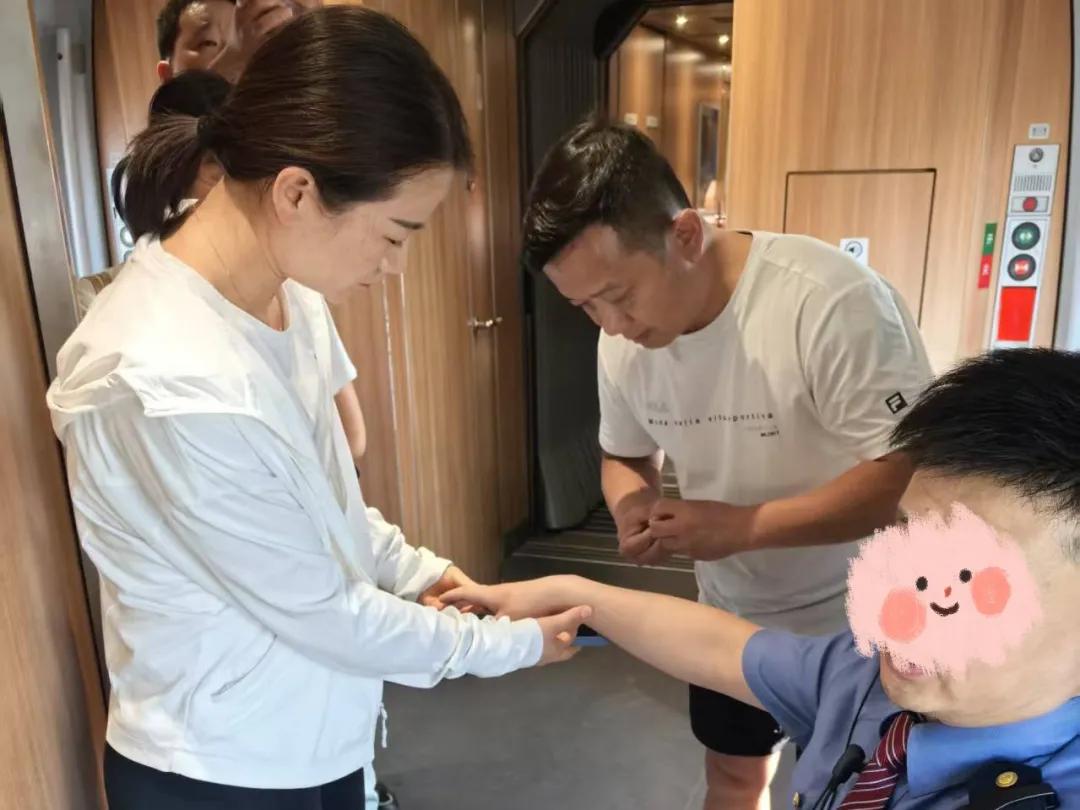 抵達(dá)現(xiàn)場(chǎng),他們發(fā)現(xiàn)一名身著列車員制服的男性工作人員面色慘白、冷汗淋漓,因腰部劇痛蜷縮并呻吟。憑借豐富經(jīng)驗(yàn),兩人判斷其可能是腎結(jié)石引發(fā)的腎絞痛。在列車工作人員協(xié)助下,潘建濤施展中醫(yī)針灸,李璐同步監(jiān)測(cè)生命體征、安撫患者。經(jīng)救治,患者疼痛明顯減輕。他們向列車方交代后續(xù)注意事項(xiàng)后默默返回座位。