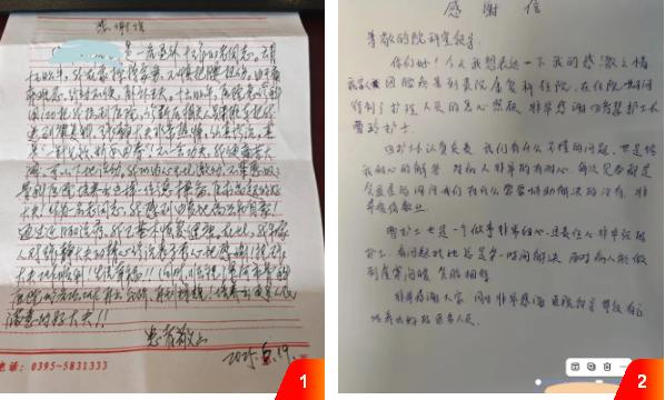 另一封感謝信來自因腰疼住院的患者,信中感謝了護士長田智慧和護士曹玲。治療期間,兩位護理人員將專業(yè)、細致的服務(wù)貫穿始終。從日常康復護理操作到患者心理疏導,她們始終保持高度的責任心,耐心解答疑問、貼心安撫情緒,用暖心服務(wù)助力患者身心康復,贏得患者由衷的信賴與感激。