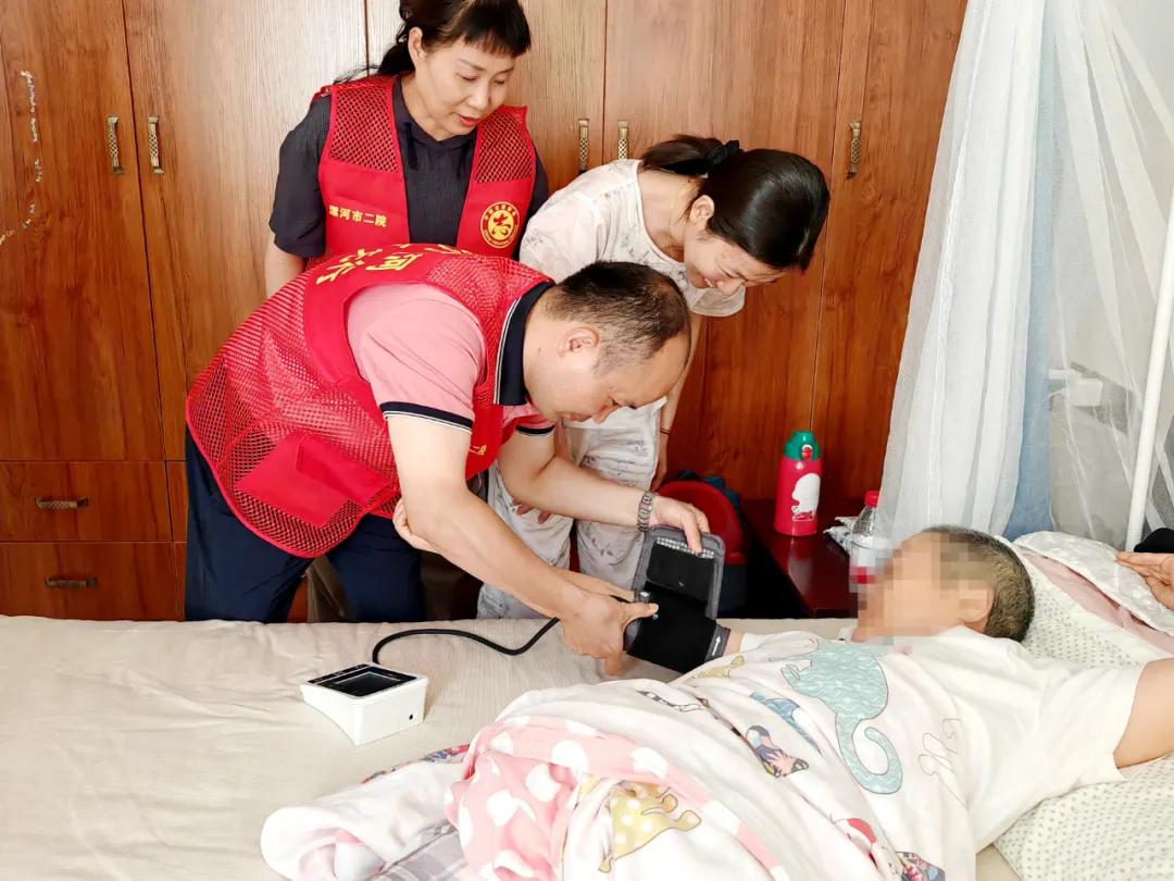 許阿姨患有心臟病、高血壓及腰椎疾病多年,天氣炎熱她的血壓一直不穩(wěn)定,家屬通過微信群向科室副主任楊光咨詢。7月16日,楊光在了解此情況后,與李慧新主任商量,決定帶醫(yī)療團(tuán)隊(duì)一起前往許阿姨家中,為她進(jìn)行血壓測量、心臟聽診等檢查,對其日常生活中的注意事項(xiàng)進(jìn)行了詳細(xì)的指導(dǎo)。同時(shí),還對許阿姨的用藥方案和康復(fù)計(jì)劃進(jìn)行了相應(yīng)的調(diào)整。