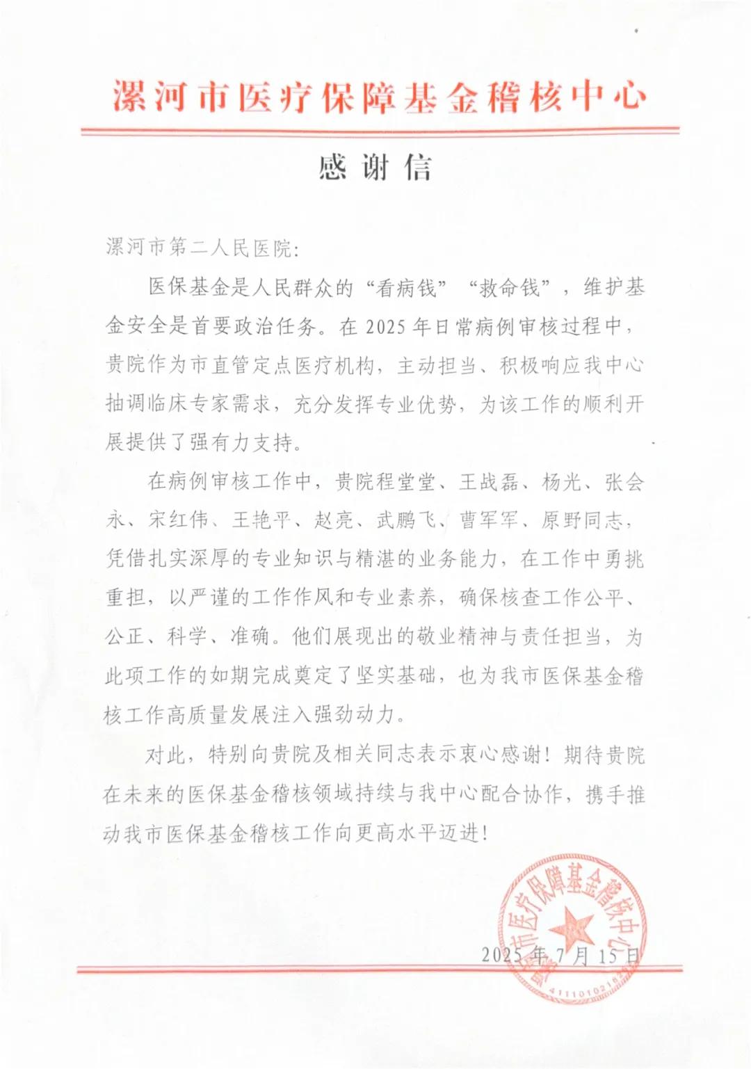 近日,市醫(yī)療保障基金稽核中心向市二院發(fā)來感謝信,對醫(yī)院選派多名業(yè)務(wù)骨干協(xié)助開展2025年日常病例審核工作表示感謝,信中高度評價市二院專家團隊以扎實的臨床功底和嚴謹?shù)墓ぷ髯黠L(fēng),高效完成病例合規(guī)性審查,為醫(yī)保基金監(jiān)管提供重要技術(shù)支持,并對醫(yī)院長期以來在醫(yī)保政策落實、醫(yī)療質(zhì)量管控方面的工作成效給予充分肯定。