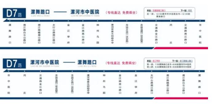 返程:交通路湘江路口、閆莊、交通路金江路口、金江路交通路口、金江路文化路口、漯河市第五初級中學(xué)、神州鳥園、金江路嵩山路口、金江學(xué)府、太行山路湘江路口、湘江路峨眉山路口、湘江路白云山路口、漯舞路口。