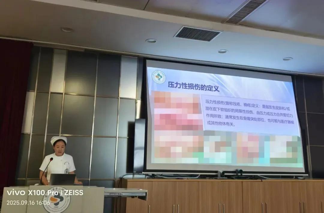 培訓(xùn)伊始,壓力性損傷/傷口護理學(xué)組會診干預(yù)組長張燕燕老師帶來關(guān)于《新型敷料在壓力性損傷中的應(yīng)用》的主題分享。她結(jié)合大量臨床案例,細致講解了各類新型敷料的材質(zhì)特性、適用場景,以及壓力性損傷不同分期對應(yīng)的敷料選擇策略、操作規(guī)范和效果評估方法。從水膠體敷料到泡沫敷料,從藻酸鹽敷料到銀離子敷料,張老師一一剖析,讓參訓(xùn)人員對新型敷料的臨床應(yīng)用有了更精準、全面的認識,為科學(xué)選擇和使用敷料提供了堅實理論支撐。
