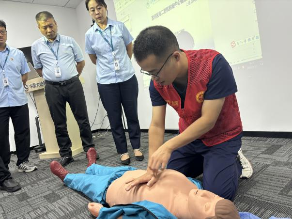 講座結(jié)束后,徐少奇醫(yī)生為大家進(jìn)行現(xiàn)場(chǎng)演示,拆解CPR操作的全部流程,并現(xiàn)場(chǎng)設(shè)置實(shí)操環(huán)節(jié),為大家進(jìn)行指導(dǎo),糾正“按壓位置錯(cuò)誤”“力度不足”等常見錯(cuò)誤,直至掌握正確的急救方法。演練現(xiàn)場(chǎng)氛圍熱烈,職工們都一一輪流進(jìn)行現(xiàn)場(chǎng)實(shí)際操作。