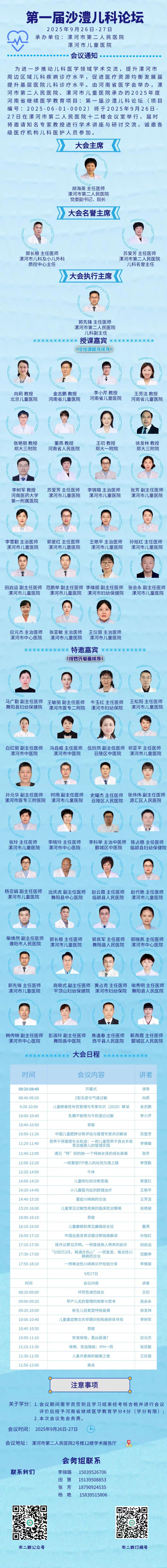 為進一步推動兒科醫(yī)學(xué)領(lǐng)域?qū)W術(shù)交流,提升我市及周邊區(qū)域兒科疾病診療水平,促進醫(yī)療資源均衡發(fā)展,提升基層醫(yī)院兒科診療水平。由河南省醫(yī)學(xué)會主辦,漯河市第二人民醫(yī)院、漯河市兒童醫(yī)院承辦的2025年度河南省繼續(xù)醫(yī)學(xué)教育項目:第1屆沙澧兒科論壇 (項目編號:2025-06-01-0002)學(xué)術(shù)會議將于2025年9月26-27日在漯河市第二人民醫(yī)院舉行,現(xiàn)將有關(guān)事項通知如下: