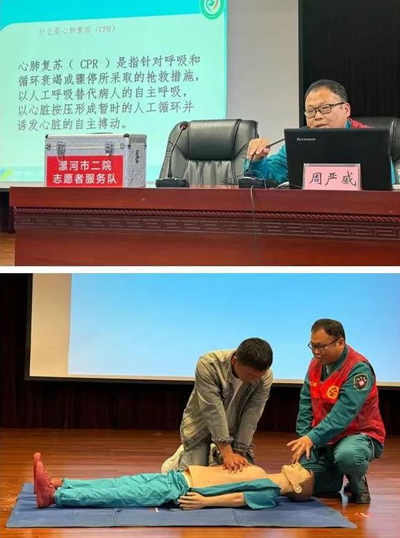隨后,急診科副主任醫(yī)師周嚴威圍繞《應急急救技能實操》進行專題講解與現(xiàn)場演示,重點聚焦海姆立克急救法與心肺復蘇術兩大關鍵技能。為讓職工更直觀掌握動作要領,周嚴威副主任醫(yī)師使用人體模型進行多輪演示,同時邀請現(xiàn)場職工上臺實操練習,確保每位參與實操的職工都能規(guī)范掌握核心步驟。
