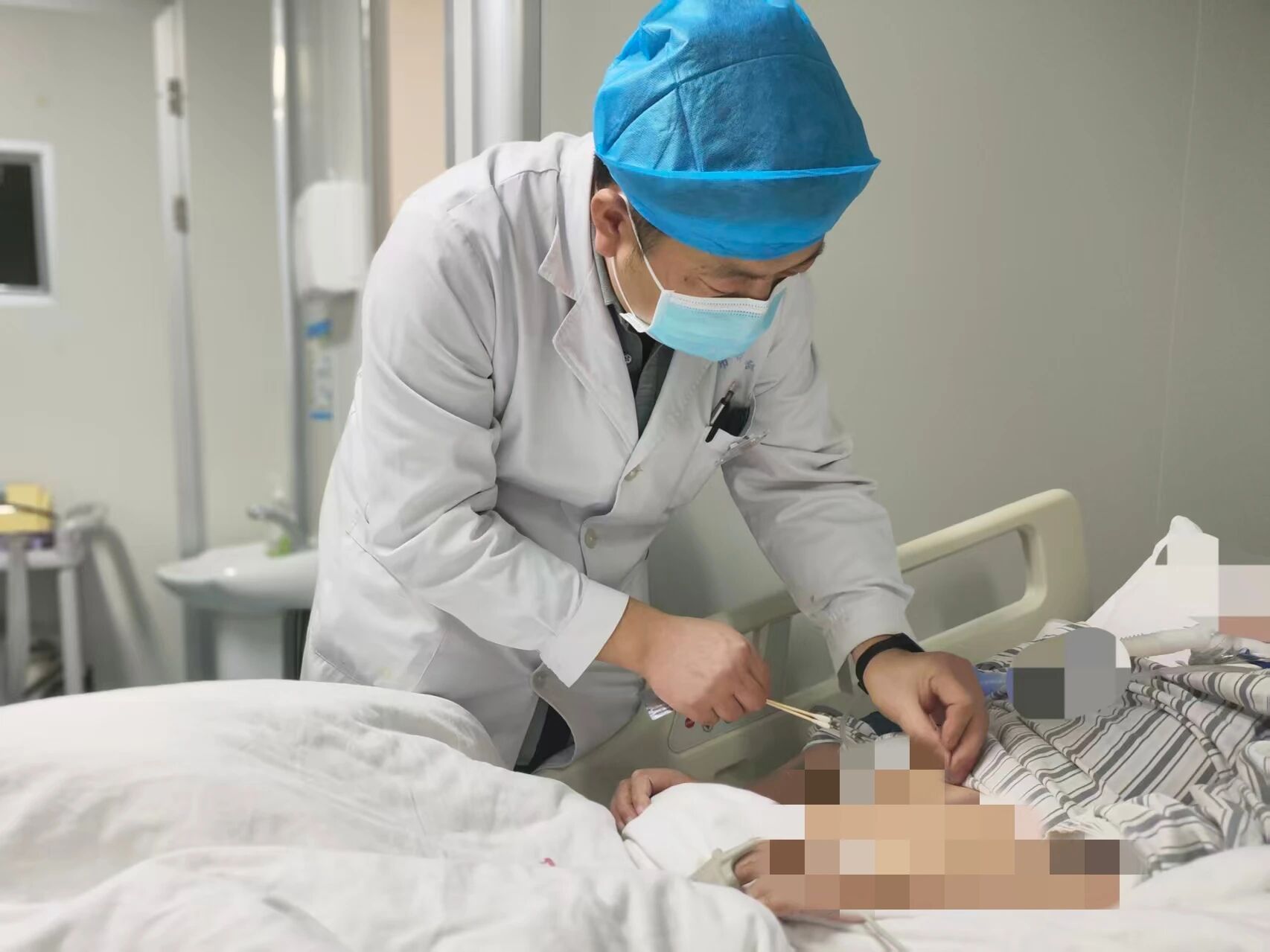 治療期間,患者出現(xiàn)嚴(yán)重腹脹,影響營(yíng)養(yǎng)吸收與呼吸功能,西藥治療緩解不佳??祻?fù)科團(tuán)隊(duì)及時(shí)介入,發(fā)揮中醫(yī)優(yōu)勢(shì):通過(guò)針灸、中藥灌腸、中藥外敷、耳穴壓豆等綠色中醫(yī)療法,與西醫(yī)治療形成互補(bǔ),腹脹難題得以緩解,為全面康復(fù)掃清障礙。