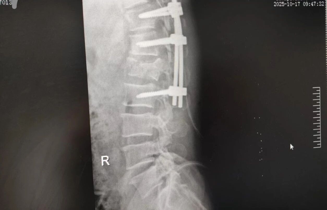 針對(duì)腰椎傷情,骨科竇志剛醫(yī)生團(tuán)隊(duì)緊急開(kāi)展腰 1 椎體爆裂性骨折切開(kāi)復(fù)位內(nèi)固定術(shù) + 椎板切除減壓術(shù)。手術(shù)室、麻醉科無(wú)縫銜接開(kāi)通綠色通道,手術(shù)團(tuán)隊(duì)快速就位,術(shù)后患者下肢活動(dòng)恢復(fù)自如。