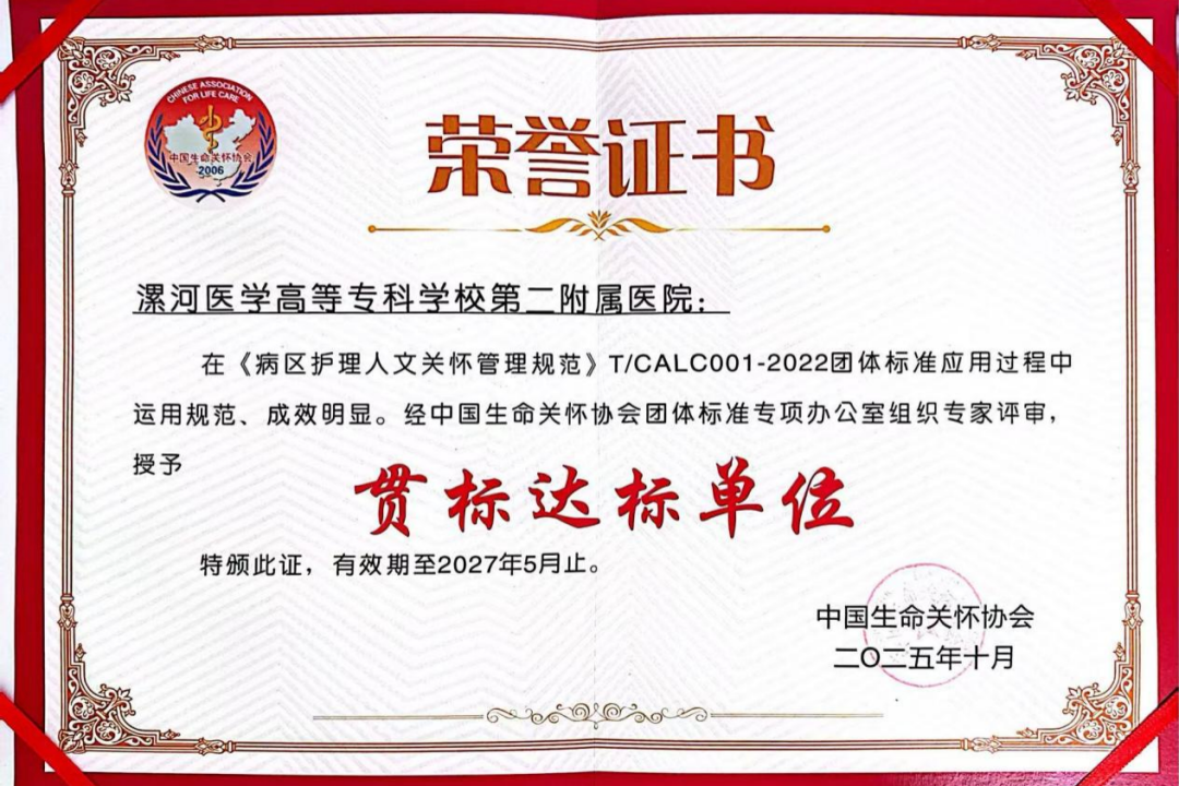 10月30日—11月2日,由國家生命關懷協(xié)會主辦、華中科技大學同濟醫(yī)學院附屬協(xié)和醫(yī)院承辦的國家級繼續(xù)教育項目“醫(yī)院護理人文關懷標準化建設”會議在武漢召開。此次大會以“關懷實踐 標準引領”為主題,匯聚了來自29個?。ㄊ小⒆灾螀^(qū))的護理界領導與專家,共同探討與展示醫(yī)學人文關懷標準化建設的前沿理論與實踐成果。在備受矚目的授牌儀式環(huán)節(jié),大會正式公布了《病區(qū)護理人文關懷管理規(guī)范》團體標準第二批貫標驗收評審結果,并現(xiàn)場為達標單位授牌、頒發(fā)證書。漯河醫(yī)專二附院(漯河市骨科醫(yī)院、漯河市立醫(yī)院)憑借在人文護理領域扎實的工作成效和卓越的服務水平,成功通過評審,被正式授予“《病區(qū)護理人文關懷管理規(guī)范》團體標準貫標達標單位”。