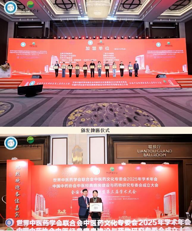 2025 年11月20-23日,世界中醫(yī)藥學(xué)會(huì)聯(lián)合會(huì)中醫(yī)藥文化專(zhuān)委會(huì)2025年學(xué)術(shù)年會(huì)、中國(guó)中藥協(xié)會(huì)中醫(yī)經(jīng)典病房建設(shè)與藥物研究專(zhuān)會(huì)成立大會(huì)暨全國(guó)中醫(yī)經(jīng)典聯(lián)盟第三屆學(xué)術(shù)大會(huì)在武漢隆重舉辦。