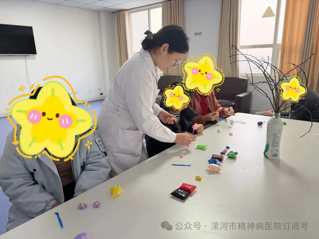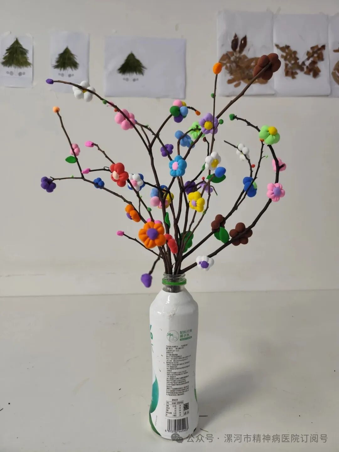 12月1日,漯河市精神病醫(yī)院心身醫(yī)學(xué)科的活動室,有點不一樣,沒有復(fù)雜的工具,只有幾包彩色粘土、撿來的枯樹枝,還有一群帶著期待的患者。醫(yī)護人員要做的,是把“春天”捏進枯枝里,裝在喝完的飲料瓶里~