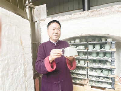 “天青色,瑪瑙釉??粗?,摸著厚。芝麻釘,釉裹足。體輕巧,內(nèi)含秀。香灰胎,蟬翼紋。晨星稀,潤(rùn)如玉。很養(yǎng)眼,不刺目……”11月4日上午,在郾城區(qū)新店鎮(zhèn)雙樓徐村,記者見到了國(guó)家級(jí)非物質(zhì)文化遺產(chǎn)項(xiàng)目汝瓷燒制技藝代表性傳承人王君子的徒弟徐大磊。一見到記者,徐大磊就用這段朗朗上口的順口溜,表達(dá)了他對(duì)天青釉汝瓷的喜愛之情。